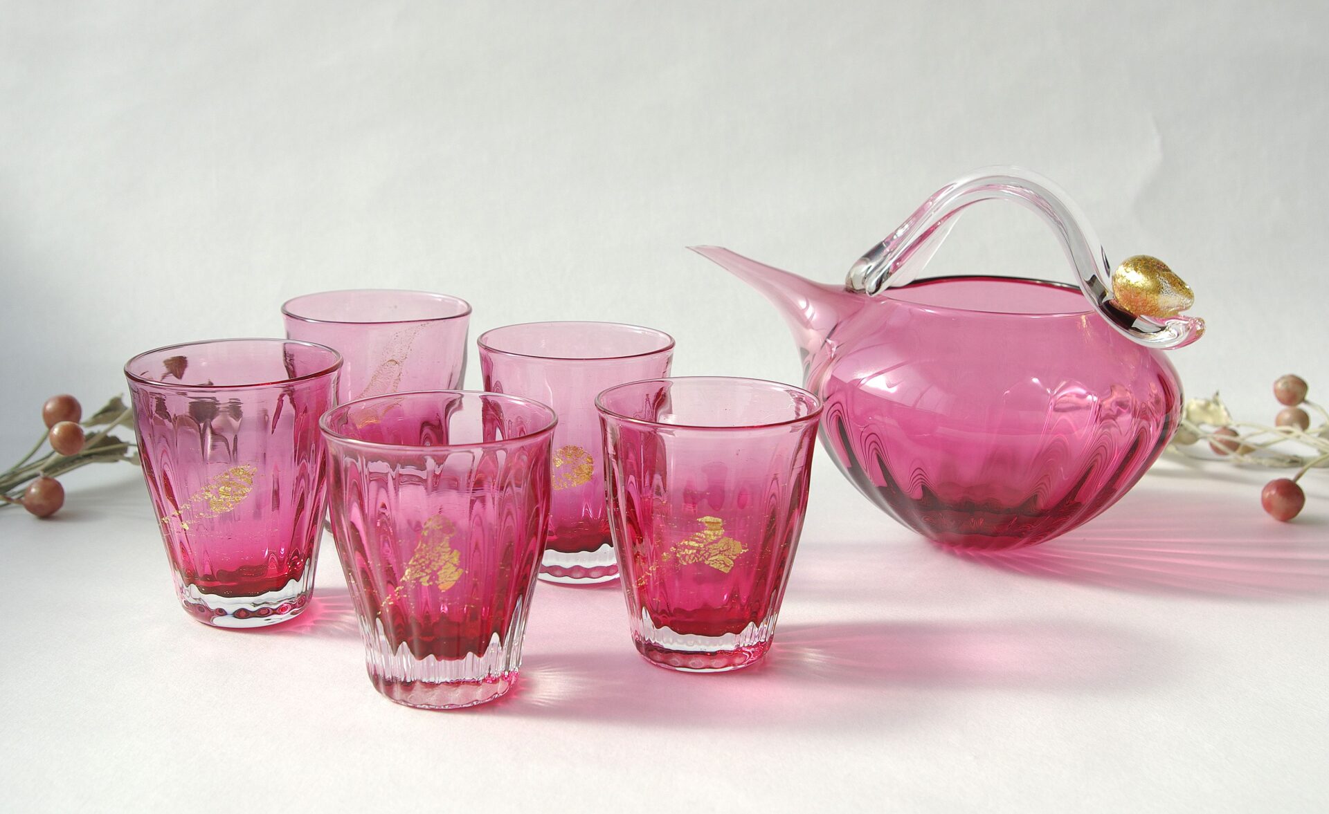 Reward(冷酒揃5客セット) 作品一覧へ お祝いの記念日や今日のご褒美に特別で華やかなひとときを過ごすための取手付、冷酒揃です。鮮やかなピンク色とアクセントに金箔を施しており、また表面の凹凸に光が当たると輝きが増します。ぜひ楽しみながらご堪能下さい。 作品情報 技法 ブローワーク(吹きガラス) 種類 酒器 他の作品をタグで探す 作品一覧へ 種類:酒器 技法:ブローワーク(吹きガラス)