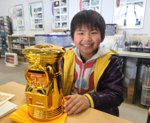 金色とカラフルなポスト型貯金箱は、毎年大人気の副賞となっており、